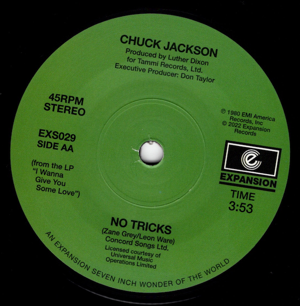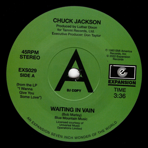 This release is a double header with two 80s gems. “Waiting in Vain” is Chuck’s sought after version of the classic Bob Marley song, original 7”copies of this selling for £150. “No Tricks” is the much revered Leon Ware/Zane Grey song never previously released on 7” single. Both songs come from the Luther Dixon produced album “I Wanna Give You Some Love” for EMI America Records. Also on Expansion CD (“Waiting In Vain” from “Terry Jones presents Village Soul Vol.2”)(“No Tricks” from “Leon Ware & Friends”)