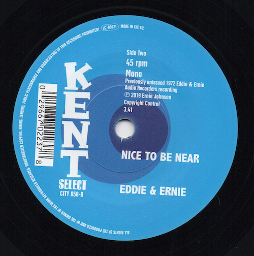 We thought that all of Eddie & Ernie’s unreleased work had been issued when we made the “Lost Friends” Kent CD but this great number – ‘Nice To Be Near’ – has since been found and now graces a re-released pressing of ‘Indication’, a track which is so hard to find on its only previous release, the UK-only Jay Boy; issued in 1972. – Ace Records