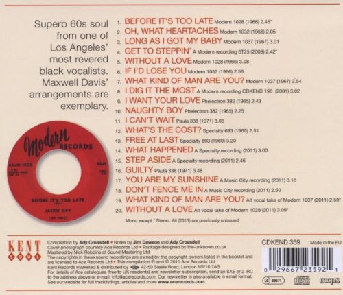 All eight of Jackie’s Modern recordings are here including the cool jazz influenced of ‘I Dig It The Most’ and the stomping ‘Get To Steppin’’ both left in the vaults until Kent issued them on Various artist CDs. The mod and Northern Soul classic ‘Before It’s Too Late’ has been re-mastered from the multi track for the first time and all the Modern recordings are digitally restored to the latest high standards, superior to any other prior releases. As a bonus, there is an alternate vocal take of Jackie’s first Modern 45 ‘Without A Love’.