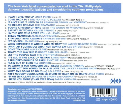 Mainstream and its subsidiaries IX Chains and Brown Dog were very classy New York labels owned by veteran produced Bob Shad. Formed in 1964 as a jazz label, it diverged into rock and soul, re-launched itself in 1970 as strictly jazz again but assimilated soul and funk until its demise in mid-1976. IX Chains and Brown Dog were strictly soul until some of the cornier excesses of disco crept in in 1976.
