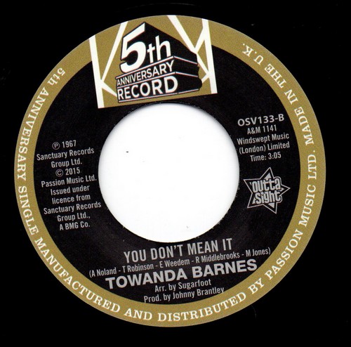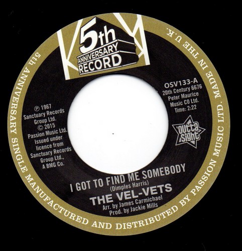 OUTTA SIGHT celebrate five soulful years – in association with Passion Music – with the release of the coverted Northern Soul classic “I Got To Find Me Somebody” by The Vel-Vets. This special 45 is coupled with the driving, funky, “You Don’t Mean It” by Towanda Barnes.